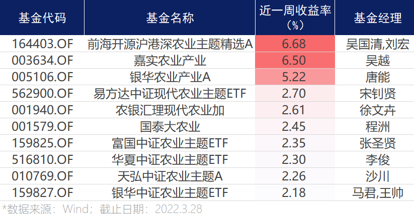 其中,多数相关基金近一周(3月21日至3月28日)收益基本为正。 前海开源沪港深农业主题精选A近一周收益最高,为6.68%, 嘉实农业产业、 银华农业A两只重仓农业股的基金近一周收益超5%,另外国泰大农业、易方达中证现代农业主题ETF、 农银现代农业加、 天弘农业A、 富国中证农业主题ETF等多只基金近一周都实现了正收益。