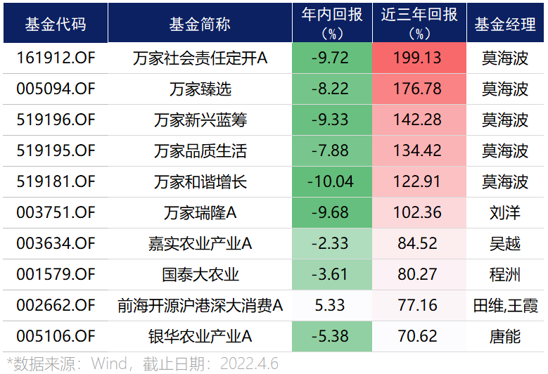 再例如前海开源沪港深大消费A,截至去年末重仓持有温氏股份、 海大集团、 天康生物、 牧原股份等,今年来的回报达到5.33%。该基金的基金经理在年报中表示,2022年将重点关注消费领域中类似生猪养殖等困境反转的机会,并保持对具备核心竞争优势、2022年基本面改善前景较大的优质企业的配置。
