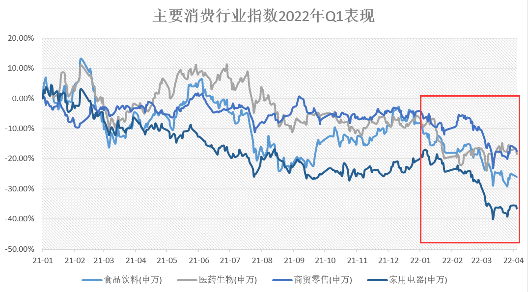 Wind数据显示,整个一季度,申万家用电器、食品饮料分别大跌20.49%、20.36%;商贸零售跌逾14%、医药生物跌近11%。