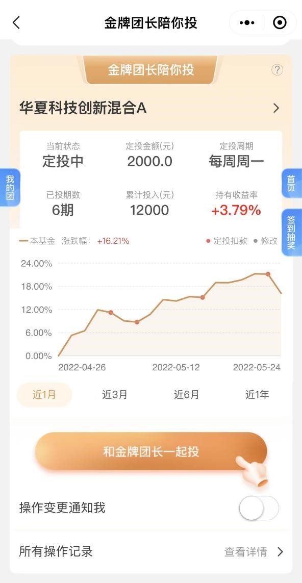 投资者不仅可以通过页面看到各个“团长”的操作记录,还可以一键跟投他们的定投计划,同时“团长”有操作变更时,平台也会提醒投资者。