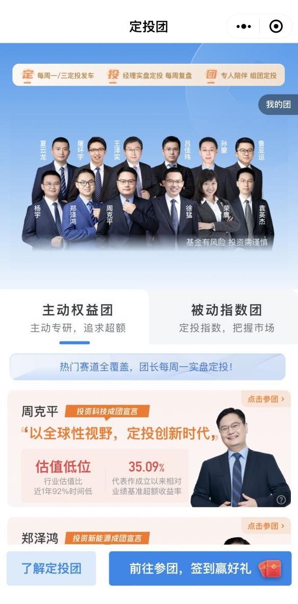 例如,近日在微信理财通等平台上,上线了一个叫做“华夏定投团”的小程序。据页面介绍,包括周克平、徐猛、孙蒙、郑泽鸿等在内的12名基金经理将分别担任主动权益团和被动指数团的“团长”,每周一实盘公开定投。