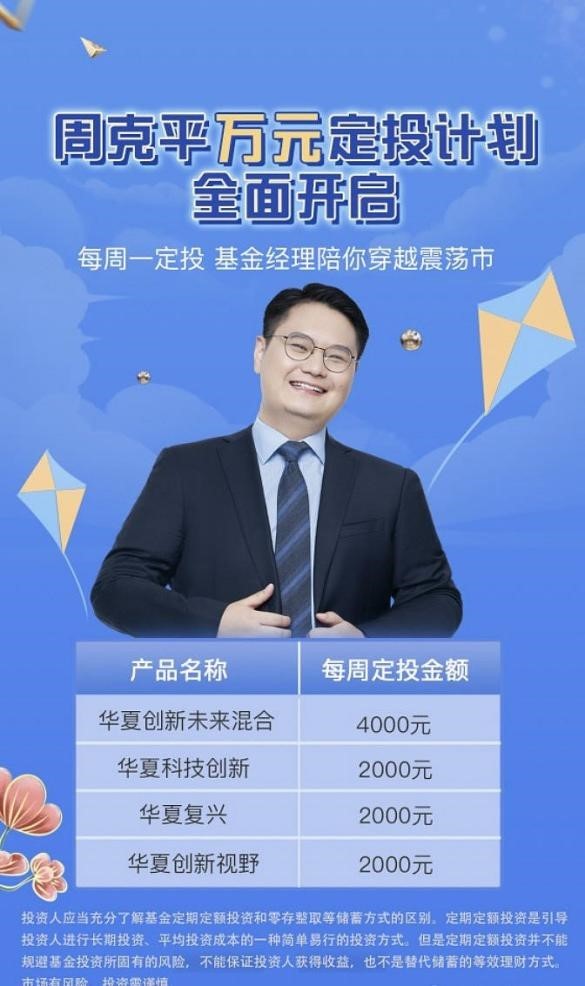最早开启这一模式的是华夏基金的基金经理周克平。他从4月14开启定投计划,投资的产品是四只他在管的基金,计划每周一坚持定投一万元,并且承诺所有定投计划至少持续到2023年底。