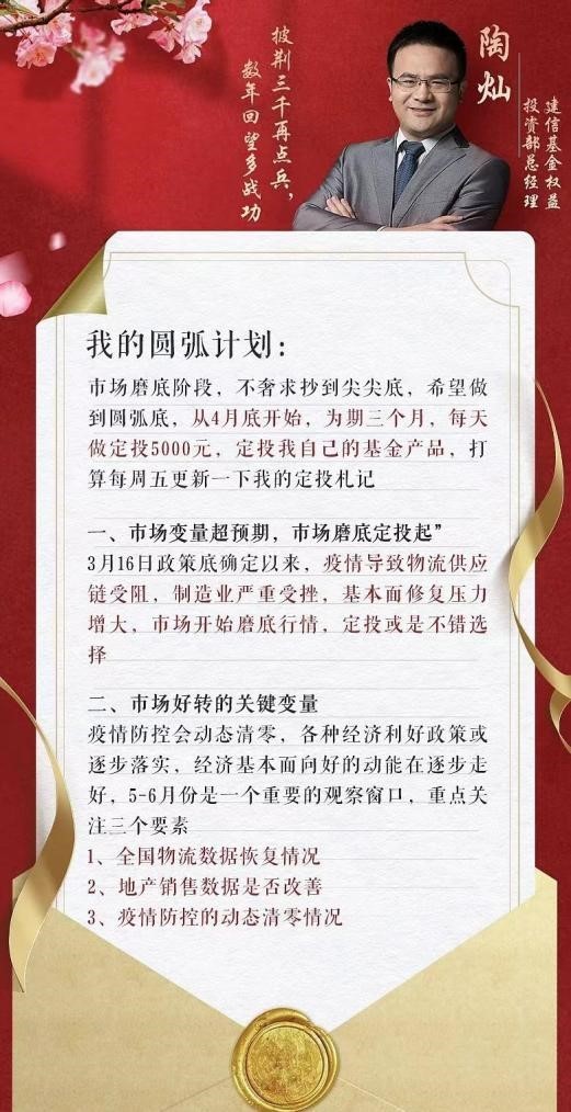 还有一位引起投资者广泛关注的基金经理是建信基金的陶灿。5月18日,他公布将启动一项名为“圆弧计划”的定投活动,从4月底开始,为期三个月,每天做定投5000元,定投他自己管理的基金产品。