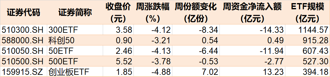 本周市场主要股指集体调整,相关ETF也跟随下跌,5只主要指数ETF中,创业板ETF、上证50ETF、沪深300ETF跌超4%。