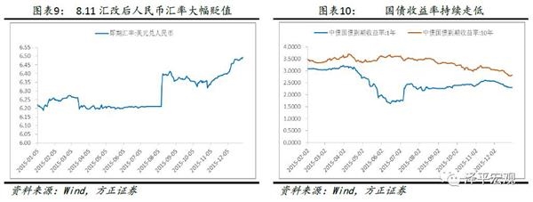 持续的外汇占款减少对人民币汇率贬值形成了一定压力。2015年8月11日,中国央行宣布调整人民币对美元汇率中间价报价机制,随后人民币汇率贬值幅度增大,人民币兑美元即期汇率从2015年8月10日的6.21贬值到2015年末的6.49.
