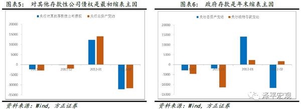本次的原因主要是周期性因素主导。11月份缩表主要是受对其他存款性公司债权减少。从数据中可以看到2011年11月央行总资产规模减少0.29万亿,其中对其他存款性公司债权减少了0.23万亿,央行通过公开市场操作收缩流动性。12月份开始受周期性因素主导。周期性因素影响包括两方面:第一,财政存款的周期性影响。中国财政存款上缴和投放表现出季节性。一般每年1、4、5、7、10是上缴期,3、6、9、12是投放期。从本次缩表看,12月份财政投放相比11月份减少1.14万亿,导致央行资产规模减少。第二,货币政策的周期性影响。一般来说,中国央行在春节前为了保持春节期间的稳定,都会进行公开市场操作、MLF等工具释放流动性,而春节后由于流动性工具到期,收回流动性。从本次缩表看,2012年01月刚好是春节,央行对其他存款公司债券相比上月增加1.23万亿,春节过后2月份时央行对其他存款性公司债券减少1.22万亿。