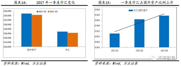 从央行的资产端来看,2017年一季度资产负债表主要变动原因是央行对其他存款性公司债权的大幅度下降,国外资产的变动是部分原因。