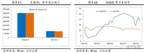 储备货币大幅度减少的结构是主要分项货币发行的减少,货币政策换将依然保持中性偏紧。从基础货币构成来看,2017年一季度货币发行总量下降超过2.1万亿。3月M1、M2同比下降,剪刀差迅速缩窄。