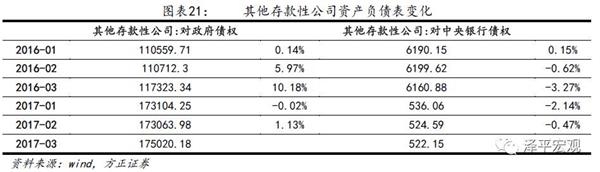 2017年一季度央行缩表对货币供应造成的影响较大。政府存款下降0.6万亿,基础货币下降超过0.5万亿。货币发行总量下降2.1万亿,其他存款性公司存款增加1.6万亿。此次缩表也主要是收紧对商业银行的资金融出。