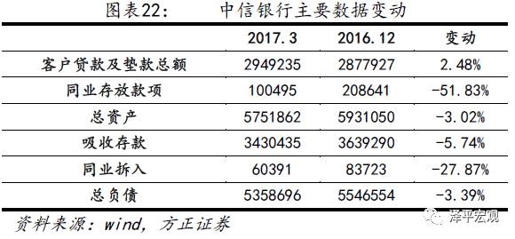 中信银行资产负债表整体缩表,2017年一季度中信银行总资产减少3.02%,总负债减少3.39%。其中,同业拆入减少27.87%,客户存款总额减少5.74%,营业规模也受到了影响。受到存放境内同业款项减少影响,存放同业款项大幅减少,下降51.83%。在资产负债表的负债端,银行吸收存款和同业拆入也在显著收缩。
