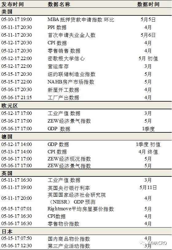 本周多位联储官员对利率、缩表时间及路径发表看法。在利率方面,威廉姆斯认为联储在年内可能会加息2-3次,布拉德认为当前利率水平相对合理,但不反对2017年再次加息,但幅度应该控制在200个基点内。在缩表时间和路径方面,布拉德希望在2017年下半年开始缩表,并认为最多可能会缩至2万亿美元;罗森格伦认为联储应采取相对迅速且循序渐进的缩表方式。联储5月会议按兵不动,但声明明显偏鹰派,带动市场加息预期升至90%,上周五发布的超预期非农数据进一步将加息预期推升至100%。目前来看,如果后续经济数据不出现明显恶化,6月加息几乎是板上钉钉。