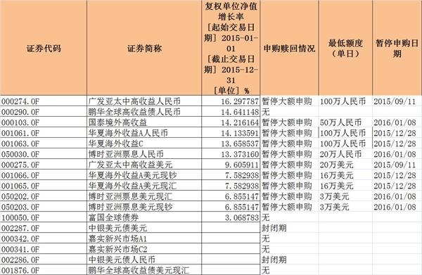 统计数据还显示,2015年QDII债券基金业绩表现不俗,其中,广发亚太中高收益人民币回报率达到16.3%,鹏华全球高收益债人民币回报率为14.64%,博时亚洲票息人民币回报率为13.4%。