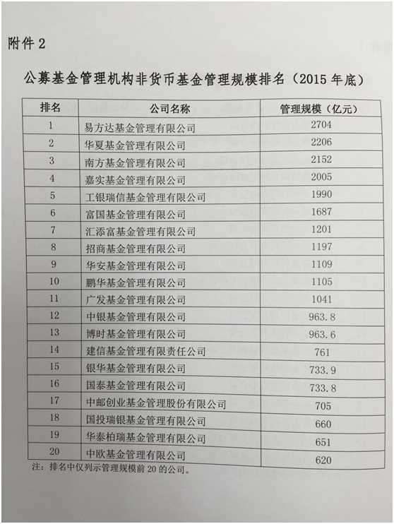 非货币公募规模方面,易方达基金2015年底非货币公募规模达到2704亿元排名第一