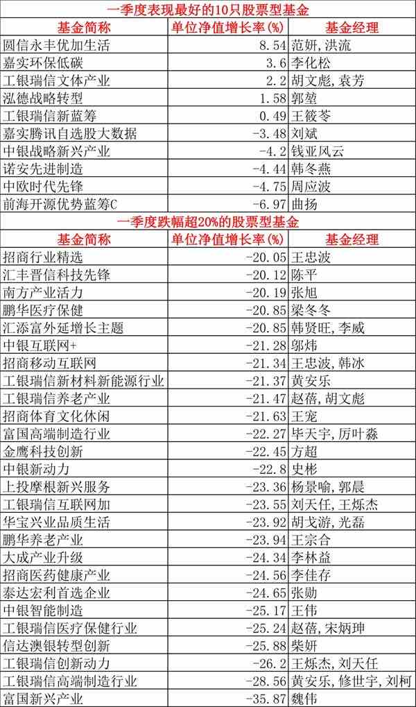 一季度股票型基金业绩分化明显,其中有5只基金逆势取得正回报,圆信永丰优加生活单位净值上涨8.54%位居第一。同时又近30只基金季度亏损超过20%,最大亏损接近36%。