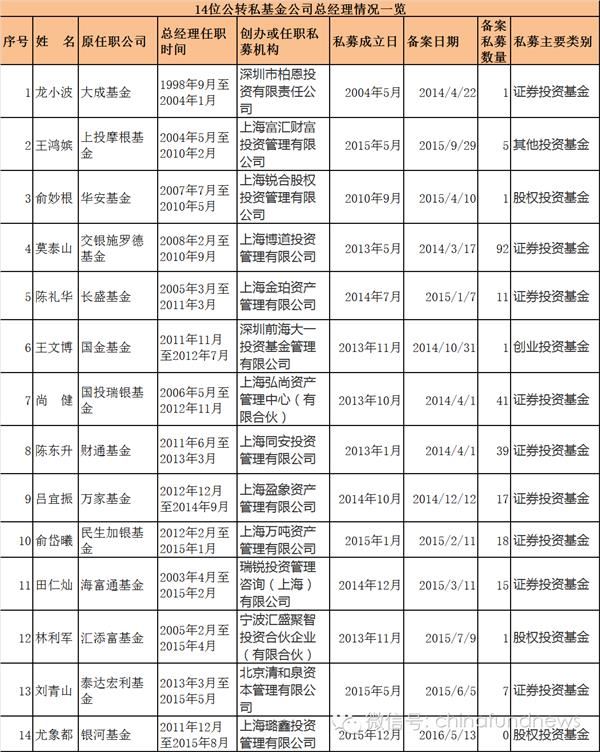 实际上,尤象都仅仅是众多弃公奔私的基金公司总经理的最新一个案例,在基金业短暂的18年发展历史中,先后至少有14位总经理离职后最终选择创业私募,以实现自我价值。