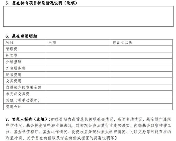 最后是季度报告,是可以自愿选择披露的。需要披露基金基本情况、基金管理人和基金托管人、基金投资运作情况、基金费用明细等,其中基金投资者情况、基金持有项目特别情况说明、管理人报告等都是选填项目。
