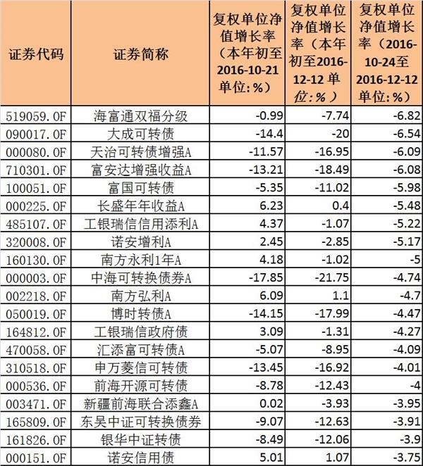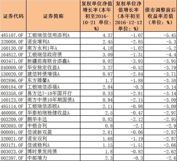 从债市调整前后的数据来看,近一个半月债市调整以来,海富通双福分级以-6.75%跌幅成为跌幅最深的债券型基金,长盛年年收益A、富国可转债、大成可转债等9只债基跌幅都在5%以上。