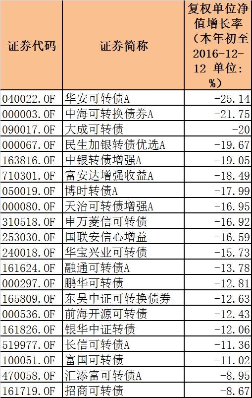 数据显示,截至12月12日,华安可转债A以-25.14%位列今年以来债基最大亏损头名,中海可转换债券A、大成可转债亏损幅度也超过了20%,这种波动幅度堪比股票型基金。