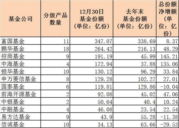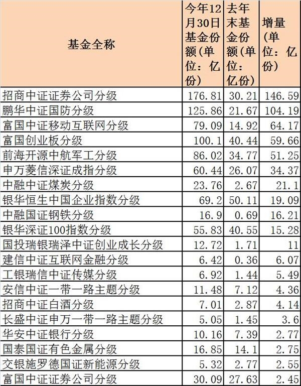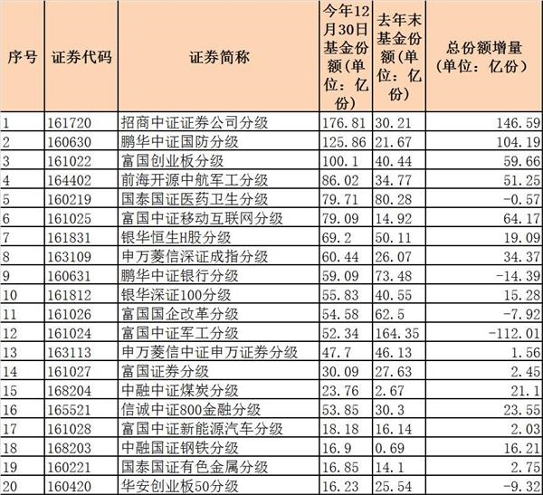 截至12月30日收盘,前海开源中航军工分级、银华恒生H股分级、鹏华中证银行分级等总份额分列3-10位,总份额在50-90亿份额不等。