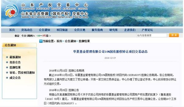 近日,山东产权交易中心发布华夏基金10%国有股权转让项目交易动态,公告显示,截止2016年12月22日,华夏基金管理有限公司10%国有股权挂牌公告期满。在公告期间,有两家以上意向受让方提交了受让申请。只有一家交纳交易保证金,中心办理了受让登记手续,中心拟采取协议转让方式组织交易。