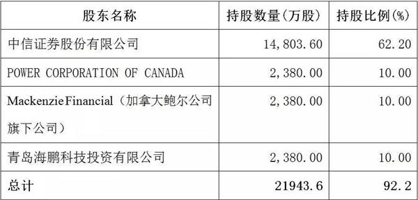 中信证券股份有限公司持股1.48亿股,股权比例为62.2%;