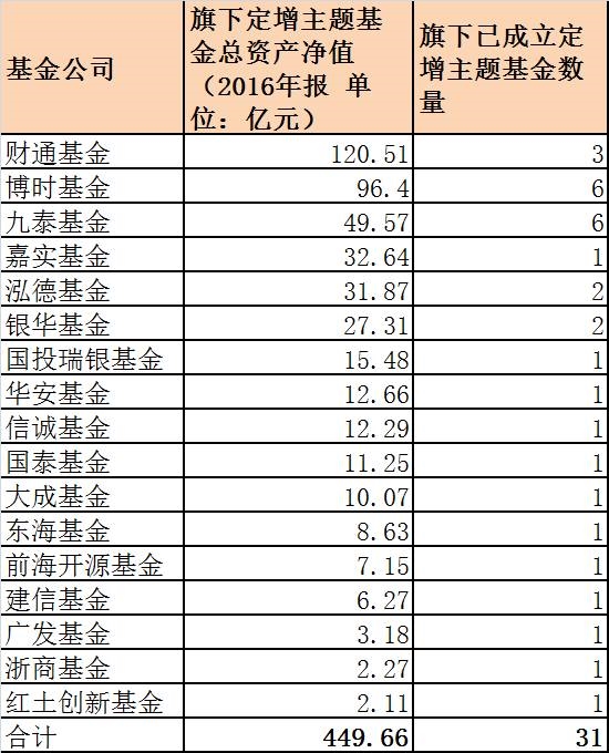 基金2016年四季报数据显示,截至2016年12月底,已有17家公募基金公司累计发行了31只公募定增主题基金,基金资产净值累计为449.66亿元。