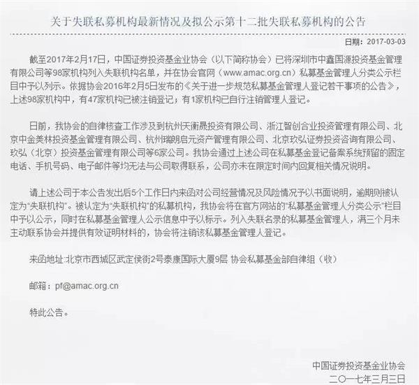 协会表示, 截至2017年2月17日,已将深圳市中鑫国源投资基金管理有限公司等98家机构列入失联机构名单,并在协会官网(www.amac.org.cn)私募基金管理人分类公示栏目中予以列示。依据协会2016年2月5日发布的《关于进一步规范私募基金管理人登记若干事项的公告》,上述98家机构中,有47家机构已被注销登记;有1家机构已自行注销管理人登记。