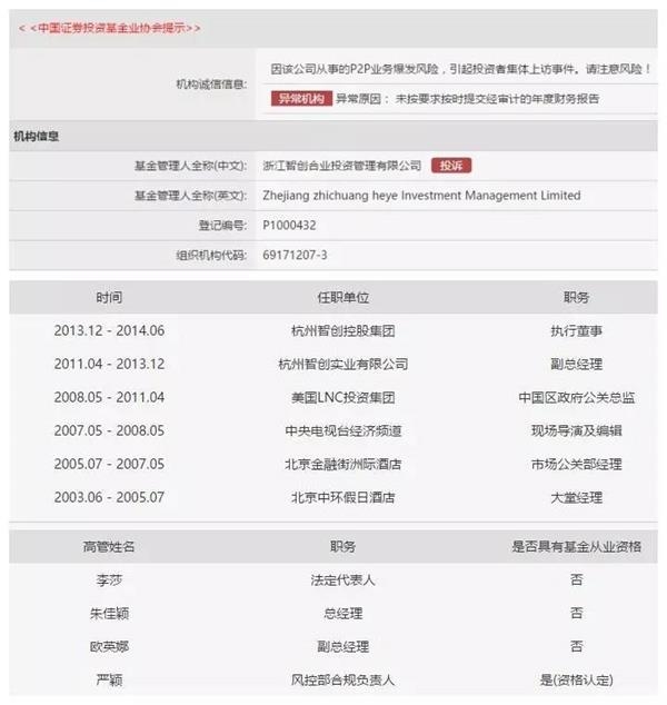 这家私募是一家P2P机构,此前因为一桩大规模的非法吸收公众存款案件被曝光。此后,据媒体报道,“智创合业投资”还与望洲集团有关联,而望洲集团去年一直处于风口浪尖,最新消息是警方通告望洲董事长杨卫国于10月28日以“非法吸收公众存款”罪送检。