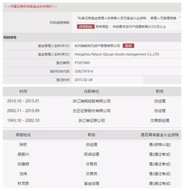 杭州瑞朗启元资产管理有限公司,该公司法定代表人为张弦,注册资本1000万,属于证券投资基金。另外,该公司被纳入“异常机构”,原因也是“未按要求进行产品更新累计2次及以上”。