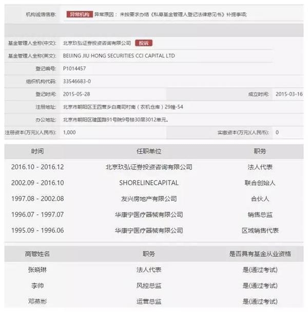 北京玖弘证券投资咨询有限公司,该公司法定代表人为张晓琳,注册资本1000万,但实缴资本为0元。属于证券投资基金。该公司也被纳入“异常机构”,原因是“未按要求办结《私募基金管理人登记法律意见书》补提事项。”