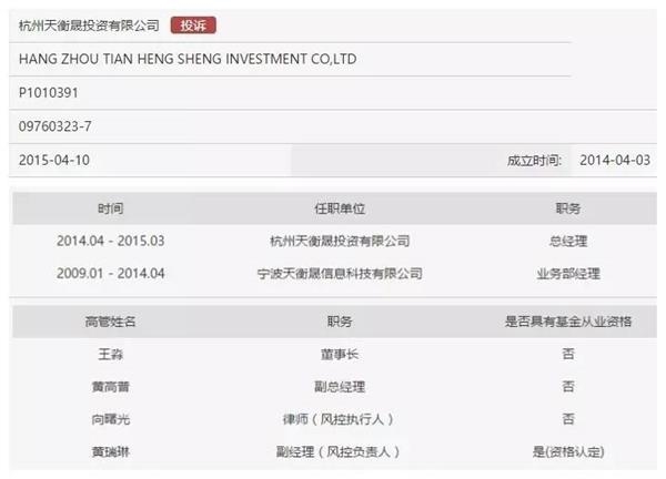 杭州天衡晟投资有限公司,该公司法定代表人为王淼,注册资本1000万,公司4位高管有3位都没有基金从业资格。