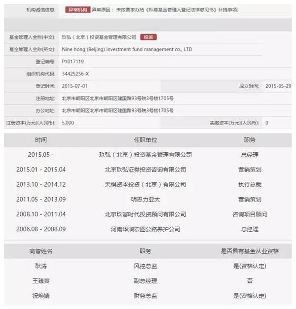玖弘(北京)投资基金管理有限公司,该公司法定代表人为耿涛,注册资本5000万,但实缴资本为0元。属于证券投资基金。该公司也被纳入“异常机构”,原因是“未按要求办结《私募基金管理人登记法律意见书》补提事项。”