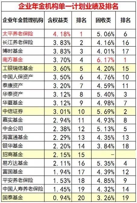 单一计划是企业年金的主题,占全部企业年金金额的九成左右,南方基金固收类单一计划企业年金平均业绩最高,达到了6.17%;太平养老保险的含权益类单一计划企业年金平均业绩最高,达到了4.18%。