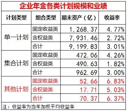 从总体业绩来看,2016年全年企业年金当年投资收益为296亿元,按实际运作规模计算的当年加权平均收益率为3.03%。
