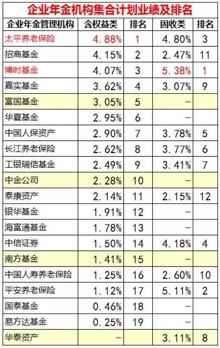 集合计划企业年金同样是基金公司在固收类排名第一,保险公司在含权益类中排名第一。博时基金公司集合计划固收类组合平均业绩为5.38%,排名第一;太平养老保险公司旗下的集合计划含权益类组合的平均业绩为4.88%,排名第一。