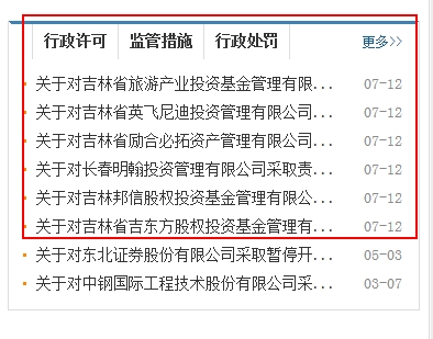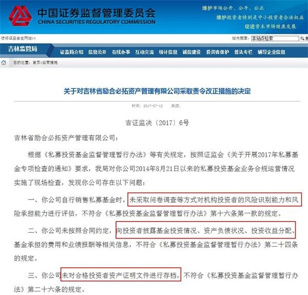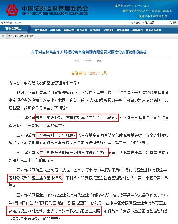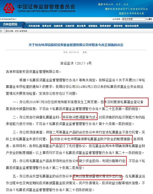 7月12日,吉林证监局一连发布6条监管措施决定,分别针对吉林省旅游产业投资、吉林邦信股权投资、长春明翰投资、吉林省励合必拓资产、吉林省英飞尼迪投资、吉林省吉东方股权投资等6家私募公司。
