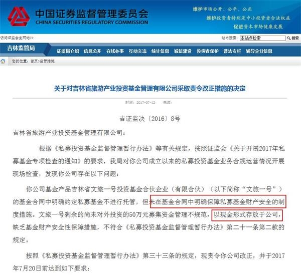 证监局在检查中发现的问题是:“文旅一号”这只产品的基金合同中明确约定不进行托管,但没有在合同中明确保障私募基金财产安全的制度措施。而且,产品剩余的尚未对外投资的50万元募集资金管理不规范,以现金形式存放于公司。
