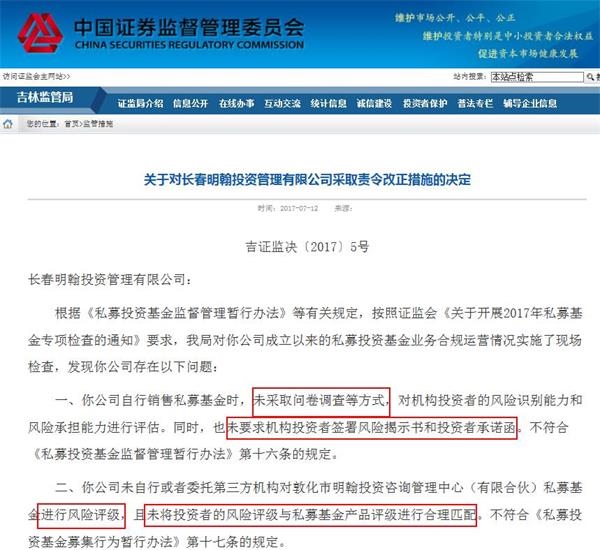 针对该私募,证监局发现的问题有2个:(1)私募自销时没有做问卷调查,同时也没有要求机构投资者签署风险揭示书和投资者承诺函;(2)没有对敦化市明翰投资咨询管理中心(有限合伙)这只产品进行风险评级,且没有将投资者的风险评级与私募基金产品评级进行合理匹配。