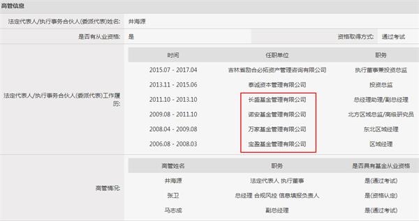 基金业协会备案登记信息显示,吉林省励合必拓资产管理有限公司的法定代表人是井海源,他曾经先后任职于宝盈基金、万家基金、诺安基金、长盛基金等多家公募公司,担任区域经理、总监/高级研究员、总助/副总经理等职务,可谓“公募”经验丰富。2013年井海源“奔私募”任泰诚资本投资总监,2015年任励合必拓资产执行董事兼投资总监。