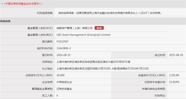基金业协会私募备案登记信息显示,瑞银资产管理(上海)有限公司成立于2015年8月19日,登记于2016年8月15日。注册地在上海浦东自贸区,注册资本1个亿人民币,实缴资本为1301.89万元人民币。