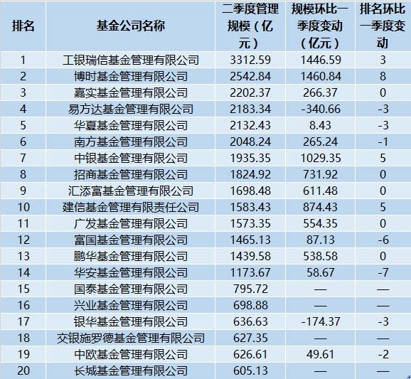 嘉实基金升位最明显,从第八名冲到第五名,其二季度月均规模为3487.2亿元。此外,建信基金、兴业基金也分别上升一位。