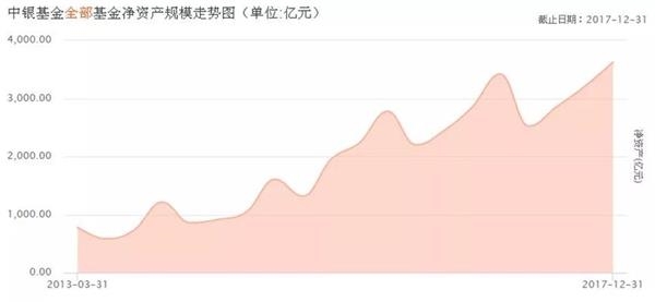 从规模增长情况来看,近年来,中银基金表现十分亮眼,截至2017年四季度,资产管理规模达3624.89亿元,4年内增长了近3倍。在2017年基金公司规模排名中,中银基金位列第九,这已经是该公司连续6年跻身TOP10。