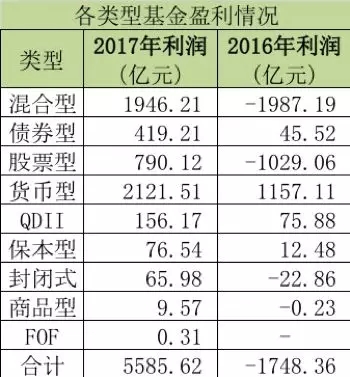 2017年,受益于全年优质大盘股的漂亮50走势,公募基金实现了5585.62亿元的盈利总和,较2016年的1754.7亿元的亏损大幅翻身。