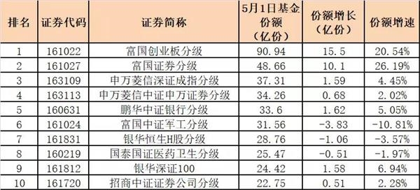 然而,随着军工板块和港股市场的回落,富国中证军工分级份额减少3.83亿份,萎缩10.81%,排名环比下降2位至第6名;银华恒生H股分级份额减少1.06亿份,萎缩3.57%,相对排名保持不变。