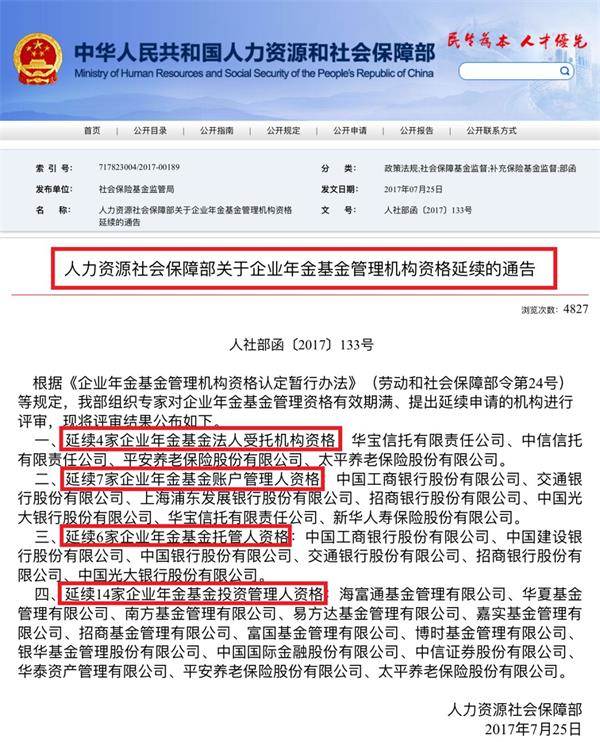 根据2017年7月人社部公告,企业年金基金管理机构资格延续情况如下: