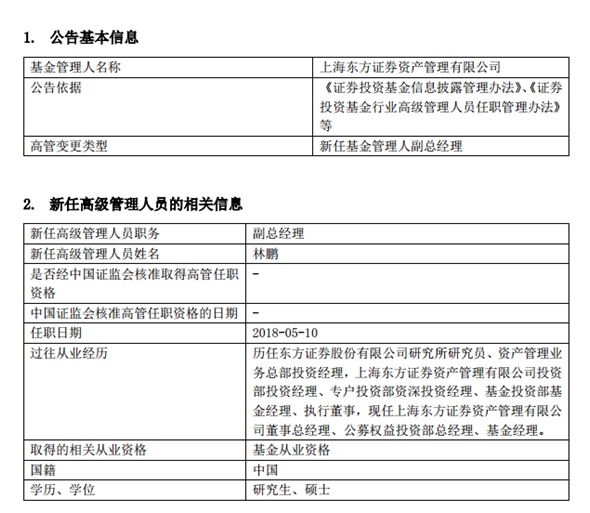 日前,东方资管发布一条公告,称基金经理林鹏自5月10日起新任为该公司副总经理。