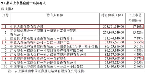 深成指A的最新年报数据显示,深成指A的前十大持有人中,中意人寿占了三席,中意人寿保险持有近3.1亿份,占比达17.1%;中意人寿旗下的团体年金持有1亿多份,占比为5.75%,中意资产管理的自有资金持有近6800万份,占比为3.77%。