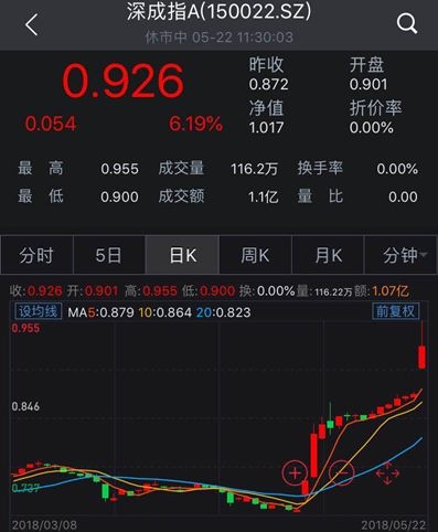 以5月2日开始计算,深成指A在4月底收盘价为0.74元,截至昨日收市,深成指A场内收盘价为0.872元,今日深成指A继续大涨,盘中涨幅逼近涨停,短短15个交易日,最高暴涨了28%。