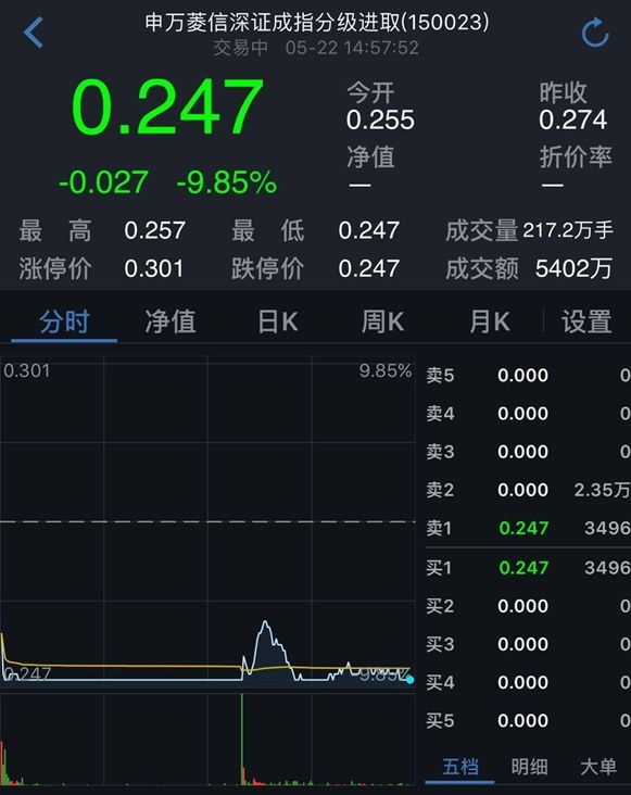 以5月2日开始计算,深成指B的4月底收盘价为0.372元,截至昨日收市,深成指B场内收盘价为0.274元,14个交易日内,深成指A的场内交易价格已下跌26.34%。