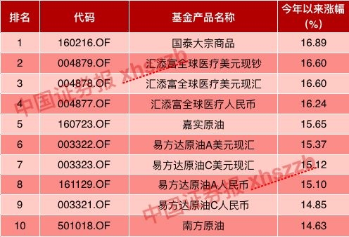 QDII基金业绩榜中,国泰大宗商品基金拔得头筹,年初截至6月26日,收益达到16.89%。排名二至四位的是汇添富全球医疗美元现钞、汇添富全球医疗美元现汇、汇添富全球医疗人民币,涨幅也超过16%。此外,前十名的其他基金被嘉实、易方达和南方等基金公司的油气类基金占据,年初至今均取得了15%左右或以上的收益。